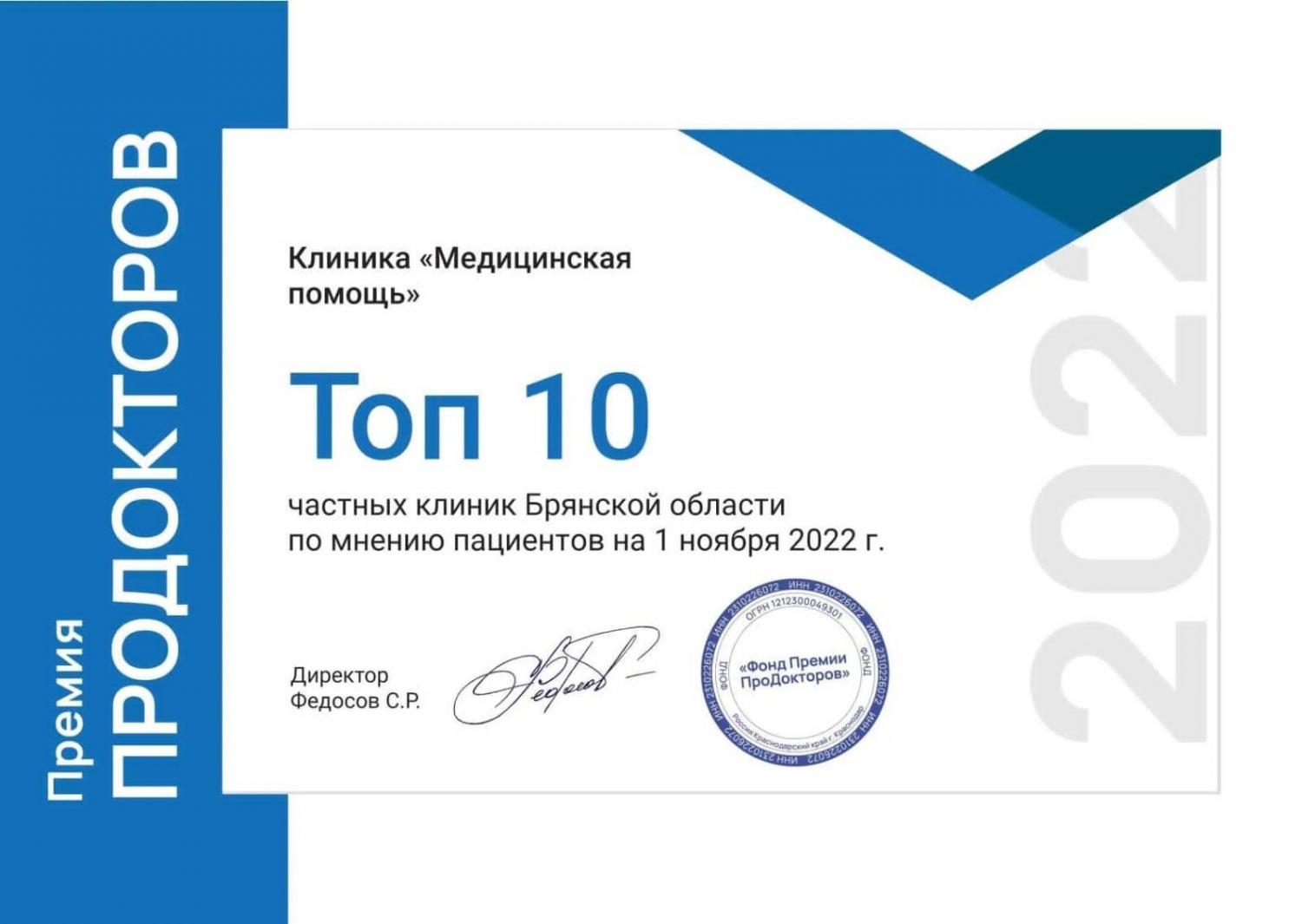Второй год подряд мы получаем премию ПроДокторов и попадаем в топ-10 клиник Брянской области! Спасибо, уважаемые пациенты, что оставляете отзывы и ставите оценки. Мы регулярно улучшаем качество своих услуг, стараемся именно для вас!